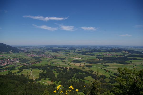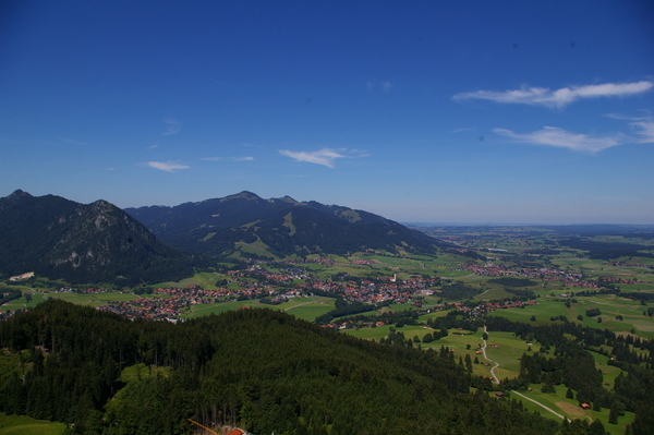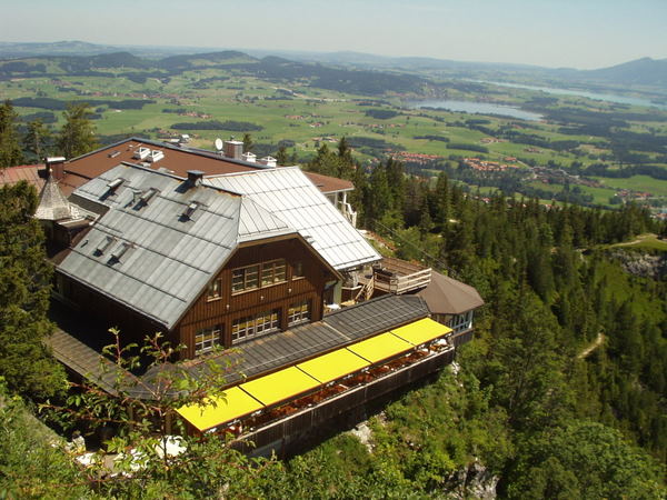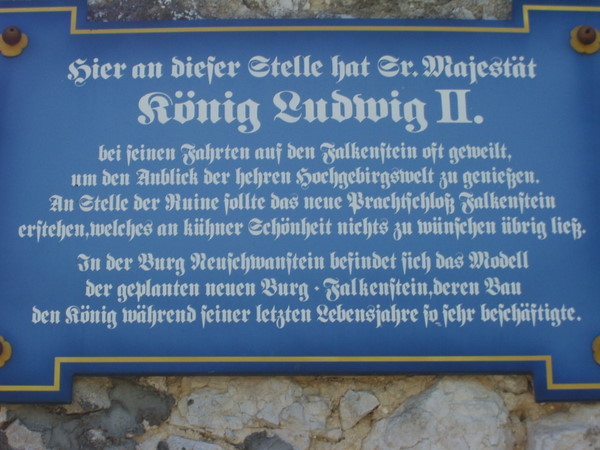 Falkenstein liegt 1268 m über dem Meer und ist damit die höchste Burgruine Deutschlands. Die Burg war 1059 als bischöflich-augsburgische Feste errichtet worden. Die Kleinheit der Anlage und die Namensgebung lässt sich vermutlich damit erklären, dass sie vom Bischof zur Ausübung der Jagd rund um den Falkenstein gebaut wurde. Mit der Errichtung der Vogtei Falkenstein 1310 wurde sie zum Amtshaus für den eingesetzten Beamten und hörte auf, bischöfliche Sommerresidenz zu sein. Ab dem Ende des 16. Jahrhunderts wird kein Beamter mehr genannt, die Burg wird zur Ruine. Erst mit König Ludwig II. kommt ihr wieder Aufmerksamkeit zu. Die romantische Schönheit hat es ihm angetan und in mondhellen Nächten genoss er von hier oben allein den weiten Blick über sein Land. Ein neues Schloss, grösser und prächtiger als Neuschwanstein sollte hier entstehen. Das Schloss selbst allerdings blieb ein Traum nach dem Tod Ludwigs 1886.