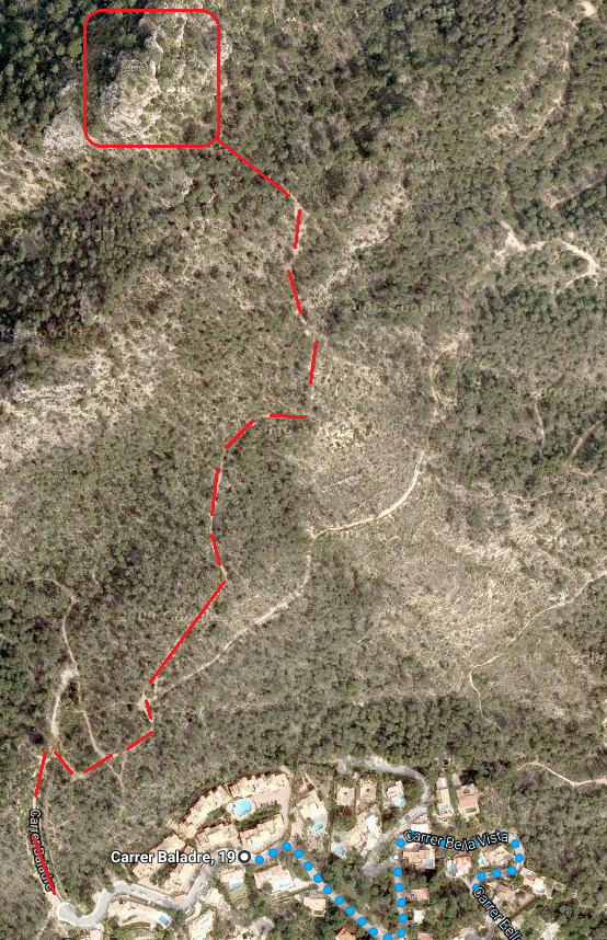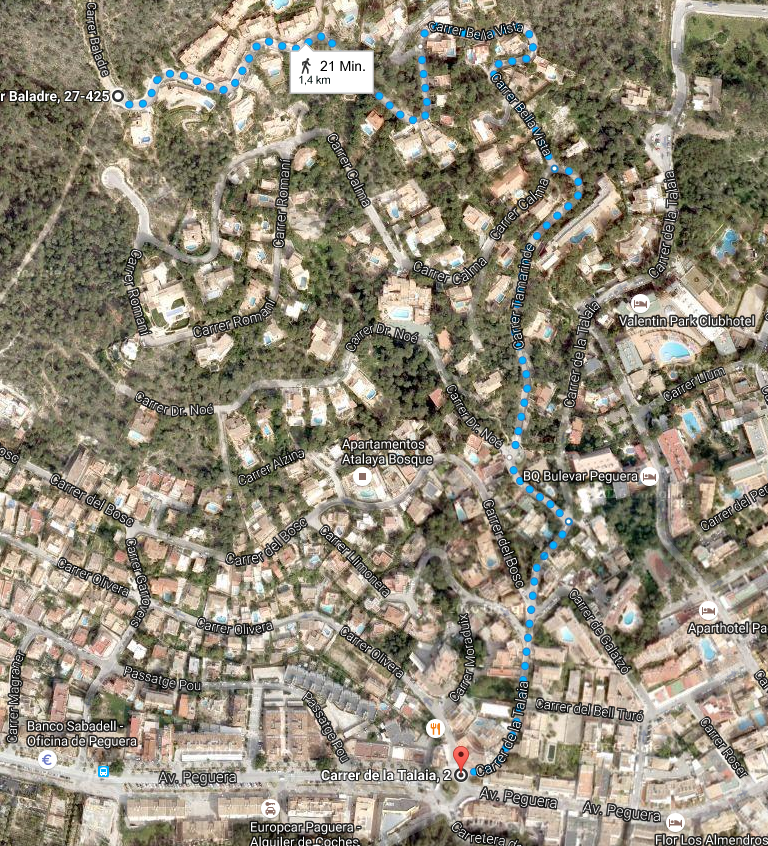 Am  Kreisverkehr die Carrer de la Talaia suchen und der Straße gegen die Einbahn aufwärts folgen. An der dritten Strasse die nach links abbiegt (bei der zweiten Ampel) links in die Straße Carrer Dr. Noe abzweigen und gleich darauf rechts in die Straße Carrer del Tamarinde abbiegen. In einer scharfen links Kurfe geht man nach rechts auf die Carrer de Bellavista. An diesem Abzweig ist auch ein Hinweisschild “Trailpark Paguera” Diese Straße geht dann über in die Carrer Baladre, dieser folgt man bis zum Ende. Dort verlässt man die Teerstraße und geht auf einem Schotterweg durch ein offenes Tor im Zaun und kommt unter einer Stromleitung durch. Gleich danach biegt man vor einem zerfallenem Haus rechts ab. Auch hier ist ein Hinweisschild “Trailpark Paguera”. Dann geht es weiter auf dem Schotterweg nochmals unter der Stromleitung durch. Nun geht man parallel  zur Stromleitung und dann nochmals darunter durch zu einer Wegkreuzung, Blickt man nun an der Kreuzung nach links sollte man einen alten Brunnenschacht sehen.