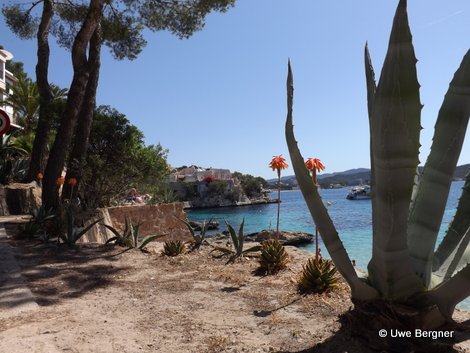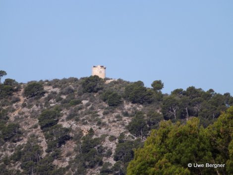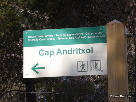 Die Wanderung beginnt am Strand von Paguera beim Hotel “MAR Y PINS” Hier geht es zuerst eine steile Treppe nach oben. Am Ende der Treppe biegt man nach links ab und folgt dem Strassenverlauf bis zur Bucht Cala Fornells. Hier geht zwischen dem gleichnamigen Hotel “Cala Fornells” und dem Hotel “Coronado” eine Strasse in den Pinienwald. Nach ein paar Minuten stößt man auf einen Parkplatz und eine Schranke. Neben der Schranke informiert eine Schautafel über Wanderwege zur Caló des Monjo, zum Wachturm Torre d´Andritxol und zum Cap d´Andritxol. Der Weg führt nun hinter der Schranke weiter bis zu einer leichten links Kurve. Hier biegt man nach rechts auf ein schmalen Pfad ab und folgt nun einfach der Beschilderung. Ein steiniger Weg führt jetzt stetig nach oben bis er wieder etwas breiter wird. Dann stößt man auf einen geöffneten Drahtzaun. Rechts von dem Zaun befinden sich eine lange Mauer und ein Eisentor. Schilder weisen darauf hin, dass es sich hier um Privatbesitz handelt und der Zutritt verboten ist. Weiter geht es bei dem Durchgang im Drahtzaun links auf einem breiteren Weg, der parallel zum Zaun aufwärts führt. Nach kurzer Zeit hat man einen herrlichen Ausblick auf das Örtchen Camp de Mar. Immer der Beschilderung folgend hat man nun bald den Torre d´Andritxol erreicht. Nach einer Pause am Torre d´Andritxol sollte man nun unbedingt noch bis zum Cap d´Andritxol gehen, das nach etwa zehn Minuten erreicht ist. Wer schwindelfrei ist, kann nun aus ca. 160 Metern Höhe einen phantastischen Blick auf das tief unter ihm liegende Meer werfen. Außerdem hat man eine tolle Aussicht nach Paguera, Santa Ponsa, auf die Vogelinseln “Islas Malgrats” und bei schönem Wetter bis nach Arenal. Anschließend begibt man sich wieder zurück Richtung Wachturm und steigt von dort wieder in die Bucht nach Cala Fornells ab. Hier kann man in einem der beiden Hotels eine Pause machen und ein kühles Getränk zu sich nehmen bevor man den Rückweg nach Paguera antritt. Für die Tour sollte man sich Zeit lassen um Aussicht und Umgebung genießen zu können. Auf der Strecke zwischen Paguera und Cala Fornells ist eine schöne Wohnanlage mit tollen Häusern in den Hang gebaut. Also den Foto nicht vergessen.